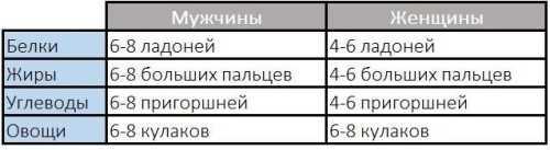 В даному випадку вуглеводи — це різні крупи і фрукти (але не цукор). Вуглеводи слід вважати пригорщами і вже приготованими. В одній жмені готової пасти приблизно 15-30 грамів вуглеводів залежно від сорту борошна.