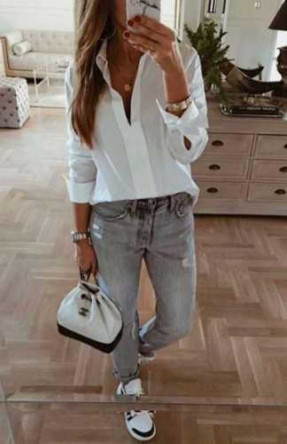 Доповнити низ досить лаконічною білою сорочкою чоловічого крою. Остання додасть вашому образу елегантності та строгості. Завершити образ можна стильним жакетом, а також мінімалістичною сумочкою.