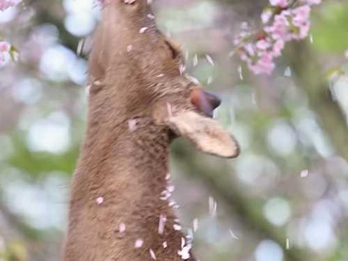 Яскраві рожеві квіти контрастують із коричневою шерстю тварини, а легкий вітерець грає з квітами, додаючи динаміки в картину. Цей момент демонструє не тільки красу японської природи, а й зв’язок тварин з навколишнім світом.